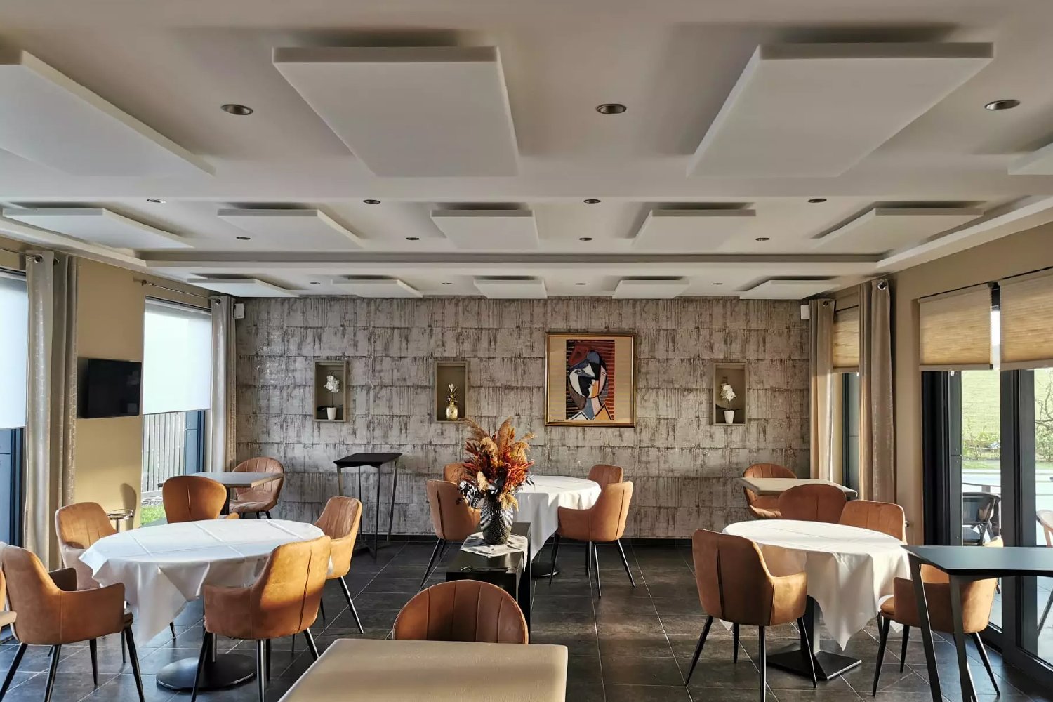 Acoustic panels for restaurants Acoustic panels and ceiling islands reduce reverberation time (RT60) and dampen disturbing reflections.